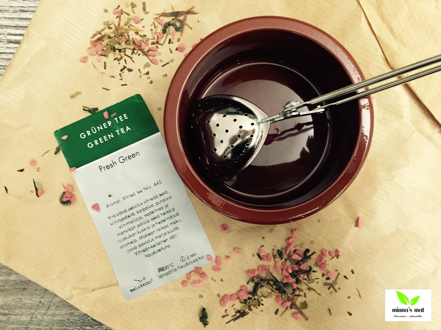 Jos ainesosat ovat vihreää teetä, viinirypäleitä, karpaloa, punaisia viinimarjoja, vadelmaa, mansikkaa ja ruiskukan terälehtiä, niin tämä Fresh Green tee on nautinto niin tuoksultaan kuin maultaankin. Maku on makean raikas, jossa on aavistus marjaisuutta ja hedelmää.
